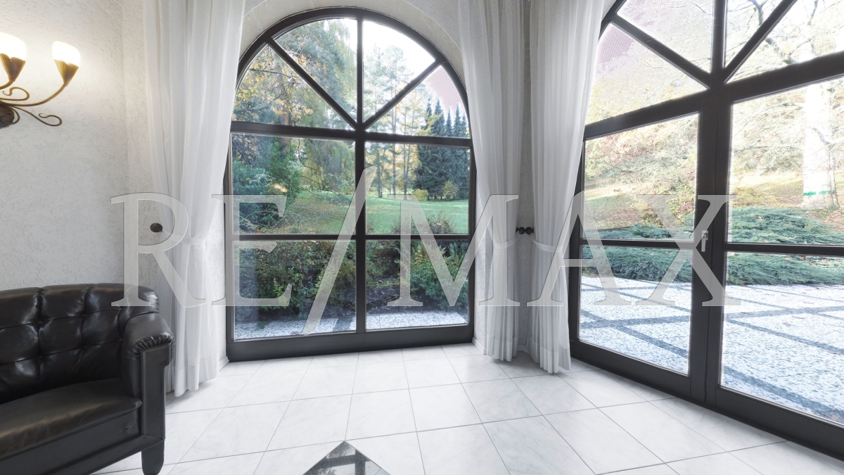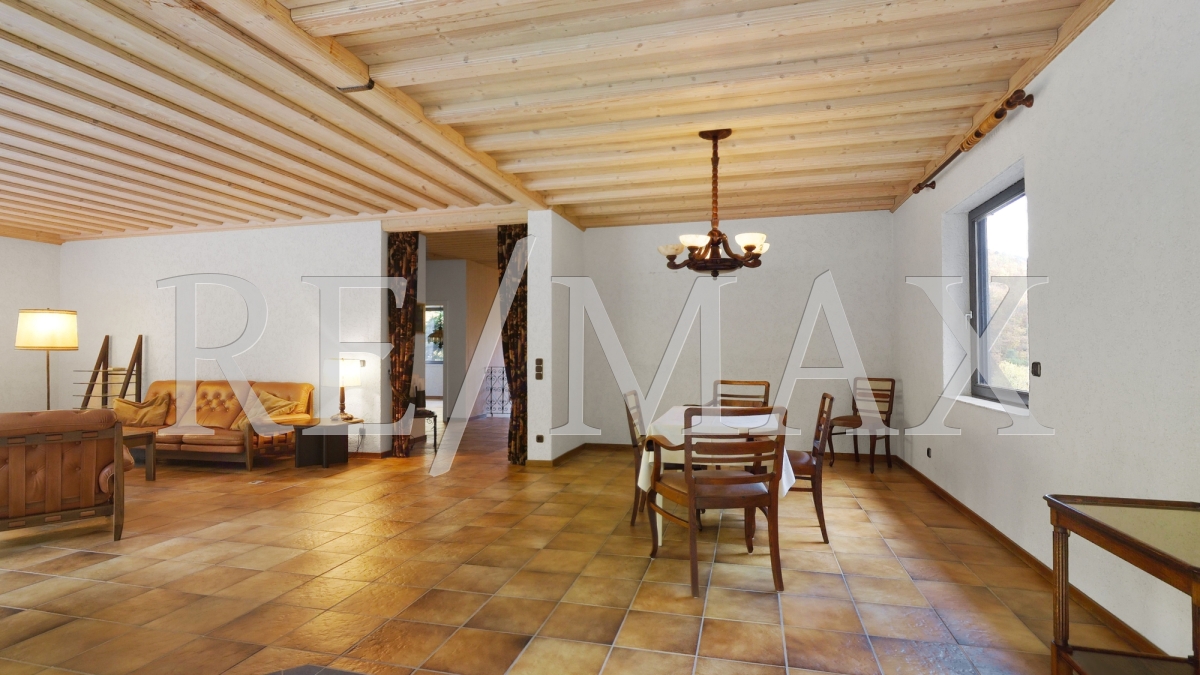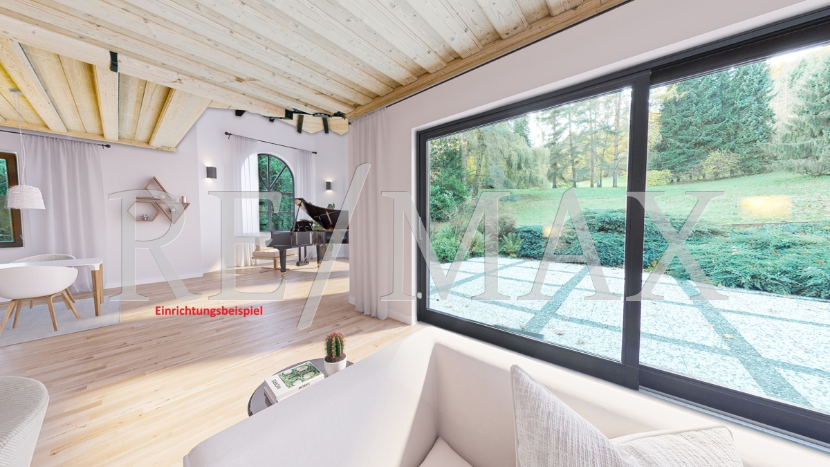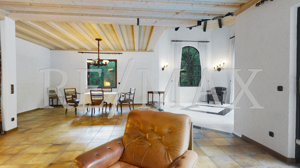 Von hier aus gelangen Sie in den sehr großzügigen Wohnbereich der mit seiner interessanten Architektur begeistert. Bodentiefe Fenster bringen viel Licht in den Raum. durch die große Schiebetür erreichen Sie die Terrasse und den Park ähnlich angelegten Garten, majestätische Bäume und gepflegte Natur lässt Sie perfekt entspannen. Hier können Sie nach Herzenslust Ihre Gäste empfangen, eine gemütliche Ruhe Oase finden oder mit den Kindern spielen.
