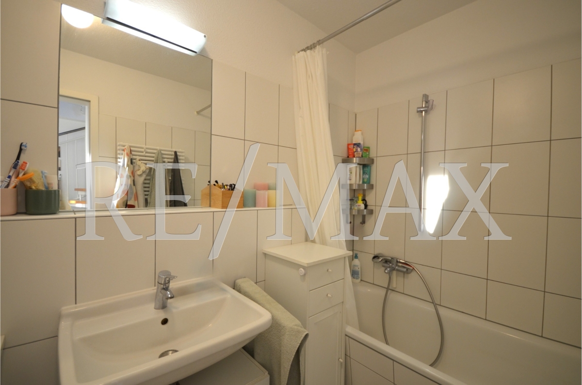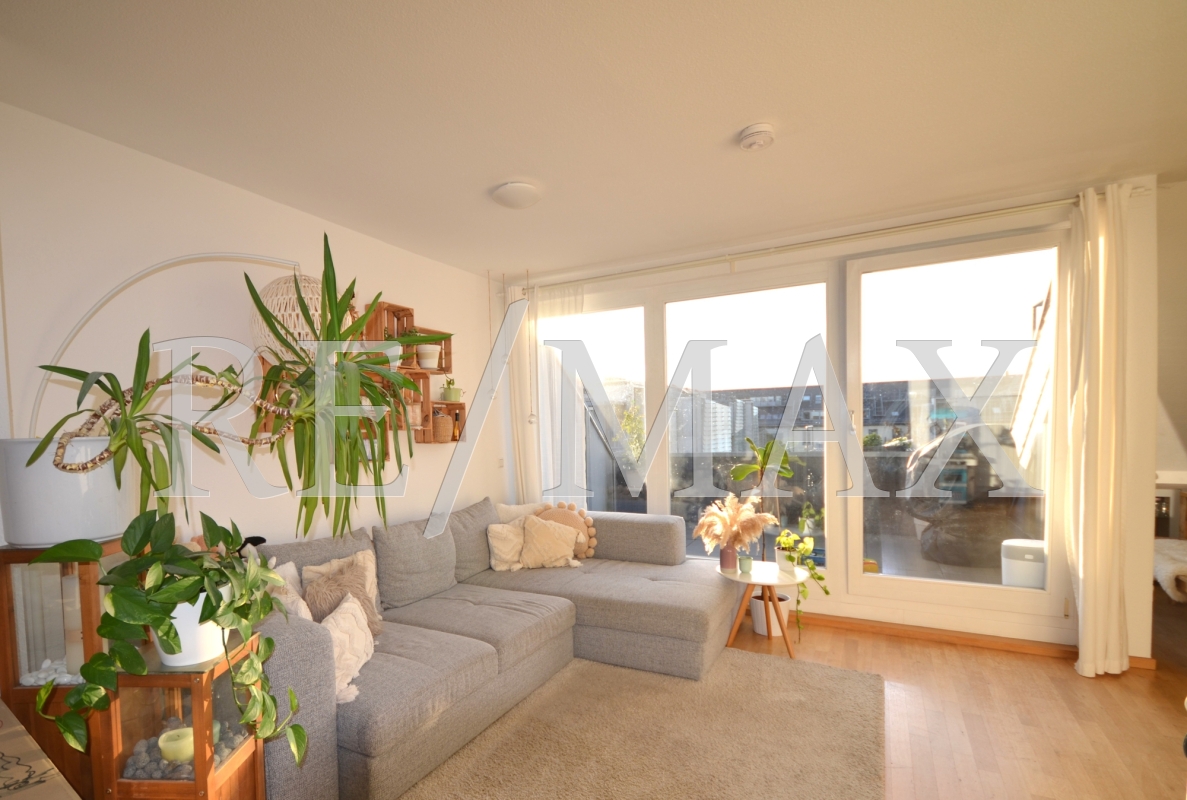 Sie betreten die Wohnung und haben rechts direkt die offen gestaltete Küche mit Einbauküche die in den Wohnbereich über geht. Von hier aus können Sie auch die hübsche Loggia betreten. Hier wurde der Bodenbelag frisch erneuert.