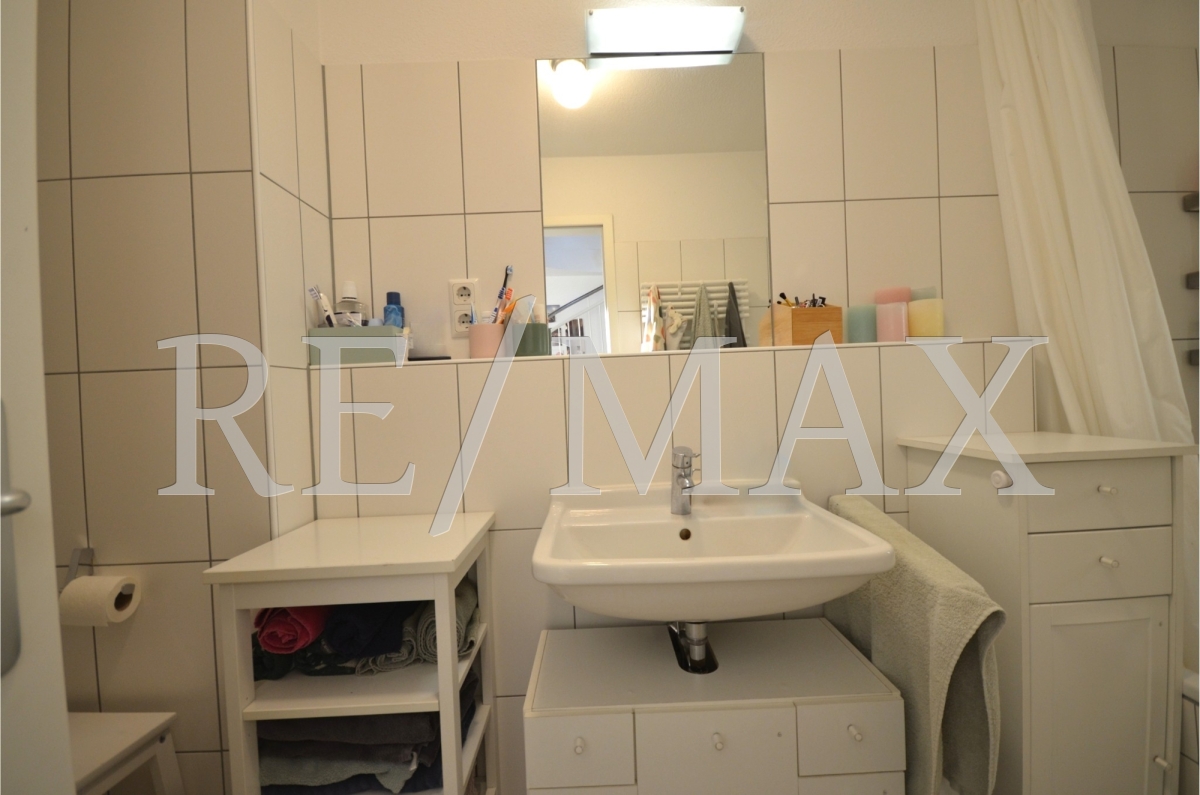 Links befindet sich das Badezimmer und der Zugang zum großzügigen Schlafzimmer, derzeit wurde eine Ankleide durch einen Schrank abgeteilt.