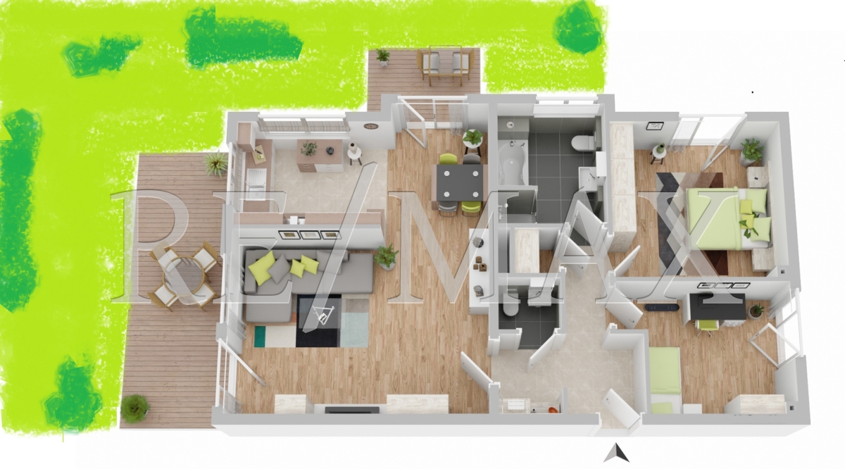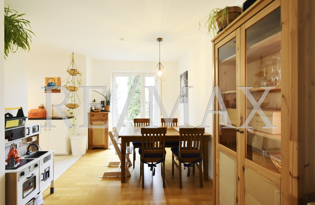 Von einem gut proportionierten Flur gelangen Sie nach links in den warmen, hellen Wohnraum mit Parkettboden. Der zur großen Terrasse gelegene Wohnbereich geht über in einen, an einer weiteren kleinen Terrasse liegenden, Essbereich. Die helle, voll ausgestattete Küche ist offen und doch separat zum Rest des Raumes angeordnet. Umgeben ist diese gesamte Fläche von einem eigenen Garten - er kann an warmen Tagen Ihr zweites Wohnzimmer werden.