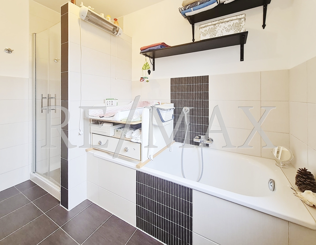 Das geräumige Tageslicht-Bad bietet Ihnen sowohl Dusche als auch Wanne und ist mit einem zeitlos-eleganten Fliesendekor und einem Handtuchwärmer bereit für Ihre Morgenroutine.