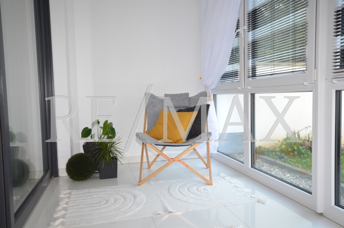 In allen Räumen sorgen hochwertige, zeitgemäße Fliesen für ein ansprechendes Ambiente. Das große, helle Wohnzimmer mit seiner großzügigen Fensterfront bietet direkten Zugang zu Ihrem beheizten Wintergarten. Hier können Sie auch in den kühleren Monaten gemütliche Stunden verbringen.