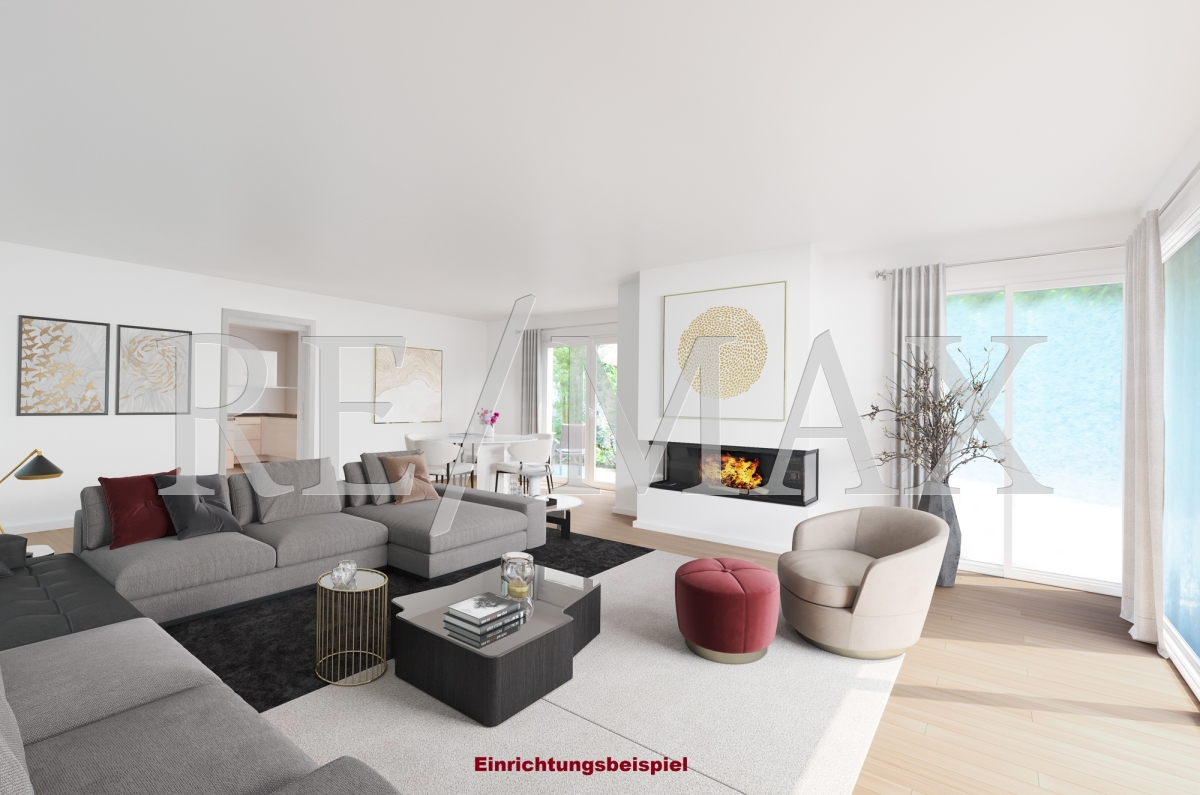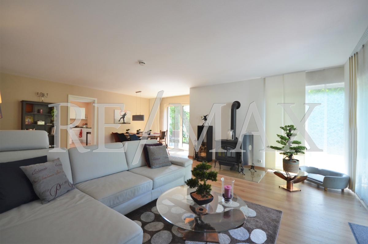 Die Flügeltür öffnet ein großzügig gestaltetes Wohnzimmer. Hier spüren Sie die Wohnqualität auf höchsten Niveau. Bodentiefe Fenster bringen viel Licht in den Wohnbereich. Ein Kaminofen beschert Wärme und Gemütlichkeit. Über die große Terrassenschiebetür im Wohnzimmer gelangen Sie auf die weitläufige Terrasse.