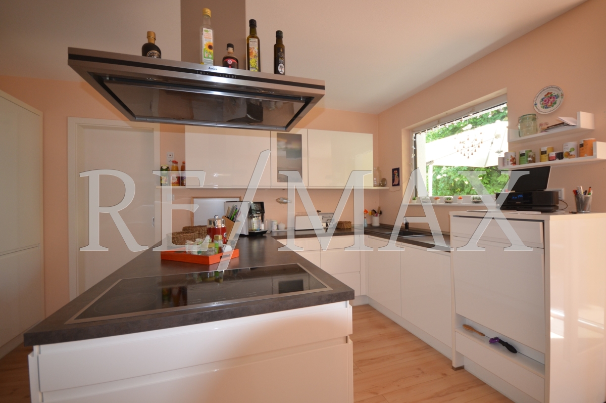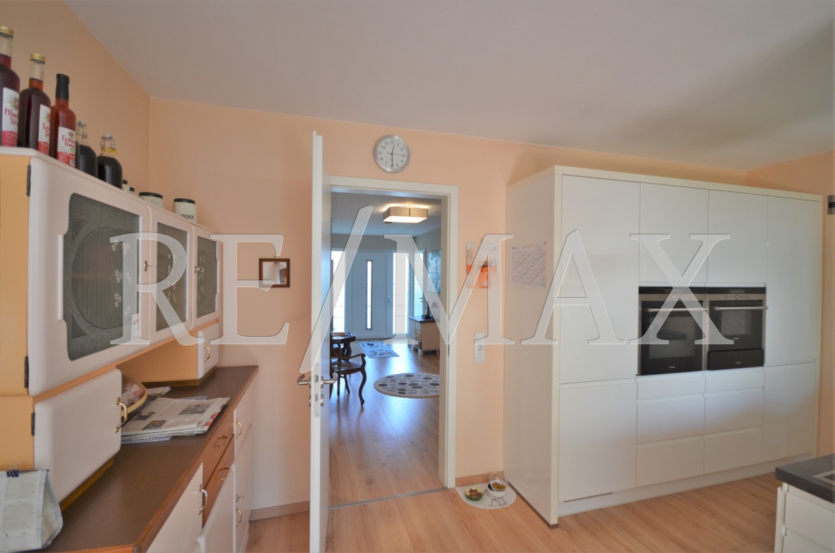 Die modern gestaltete Küche mit einer hochwertigen Einbauküche und einer Speisekammer lässt keine Wünsche offen.