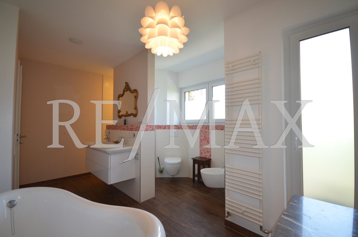 Das Hauptschlafzimmer verfügt über ein eigenes Bad und 2 Ankleiden, die für einen guten Start in den Tag sorgen. Das außergewöhnliche Tageslichtbad ist mit einer frei stehenden Badewanne und einer Dusche ausgestattet. Zusätzlich gibt es ein Bidet und eine Toilette.